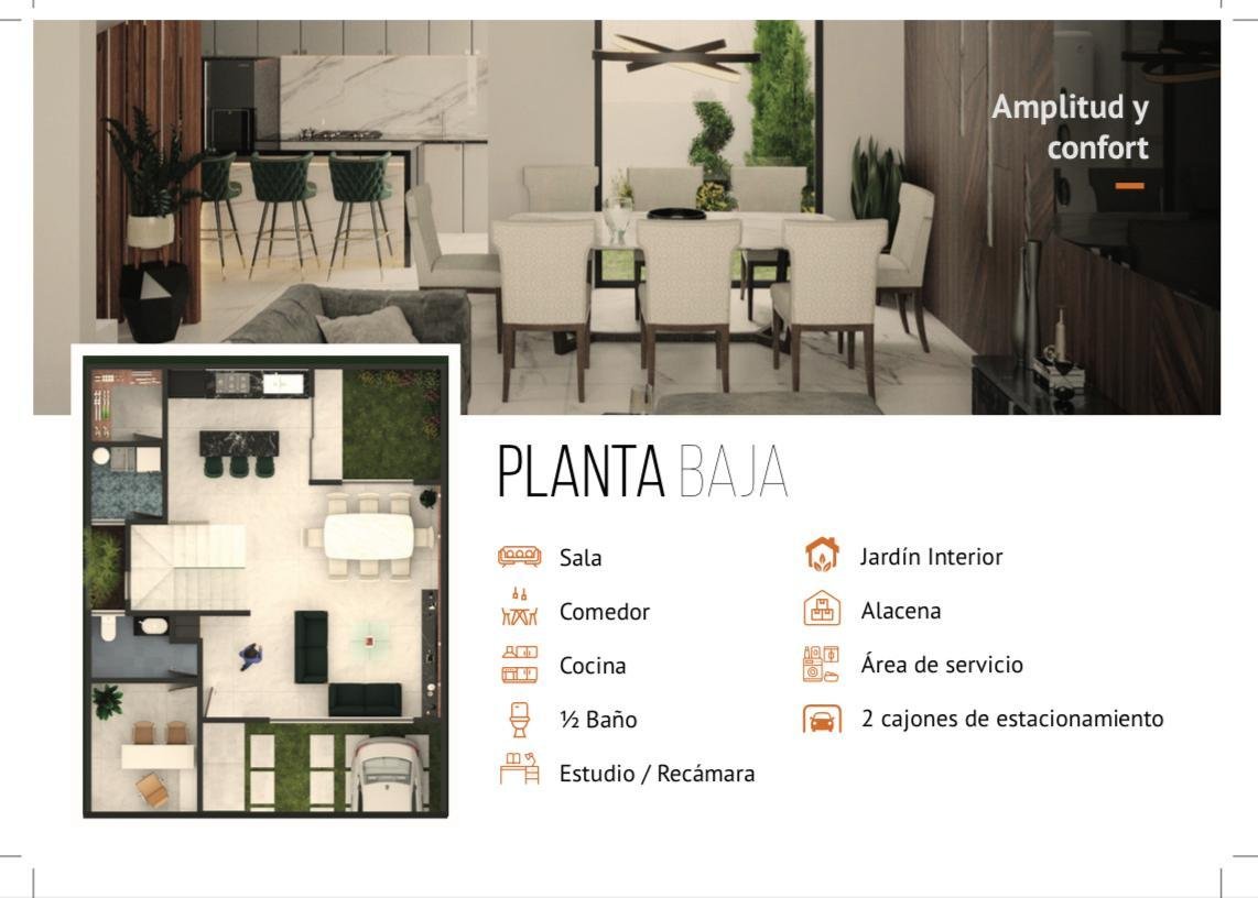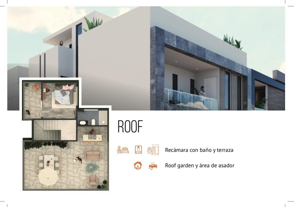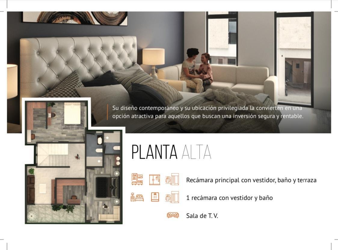 Descripción: $3,750,000 127.40m2 de terreno 265m2 de construcción Planta Baja: -Sala -Comedor -Cocina -Alacena -Área de servicio -1/2 baño -Estudio o recamara -Jardín -2 cajones de estacionamiento Planta Alta: -Recámara principal con vestidor baño y terraza -Recámara con vestidor y baño -Sala de TV Roof: -Recámara con baño y terraza -Roof Garden y área de asador *Preparacion Estructural para un 3er Nivel